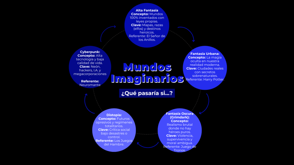 • Alta Fantasía (High Fantasy): Historias épicas que ocurren en mundos completamente inventados, con sus propias reglas físicas, razas (elfos, orcos) y mapas. El destino del mundo suele estar en juego.